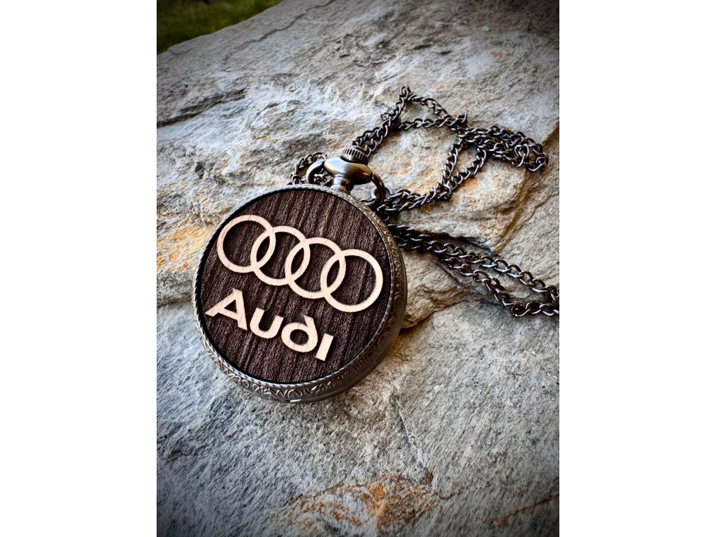 Stylové kapesní hodinky ze slitiny kovu a dubového dřeva na dlouhém řetízku