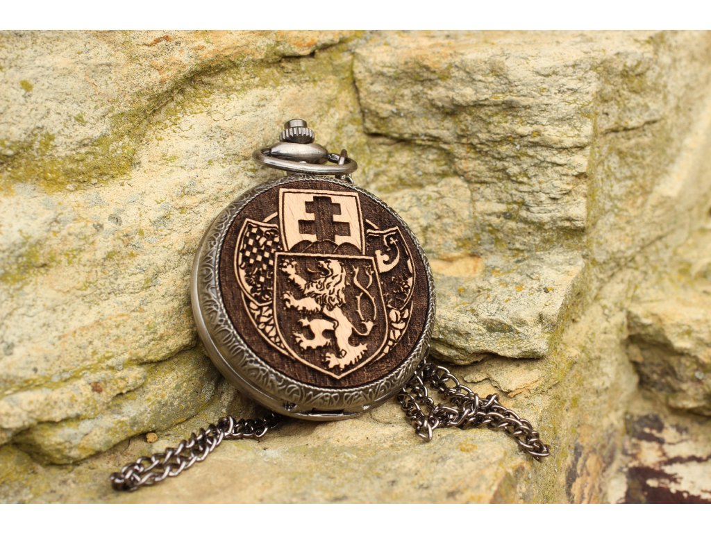 Stylové kapesní hodinky ze slitiny kovu a dubového dřeva na dlouhém řetízku
