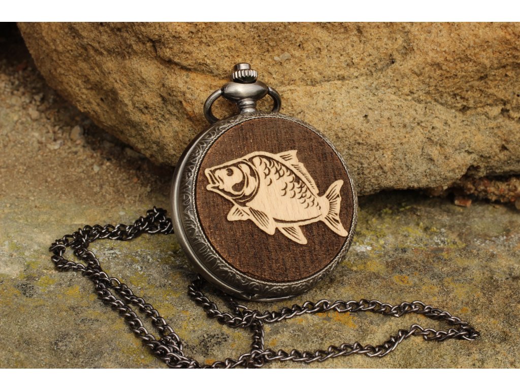 Stylové kapesní hodinky ze slitiny kovu a dubového dřeva na dlouhém řetízku