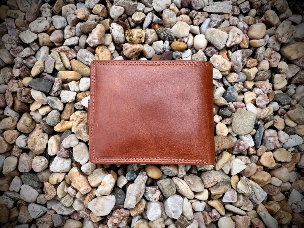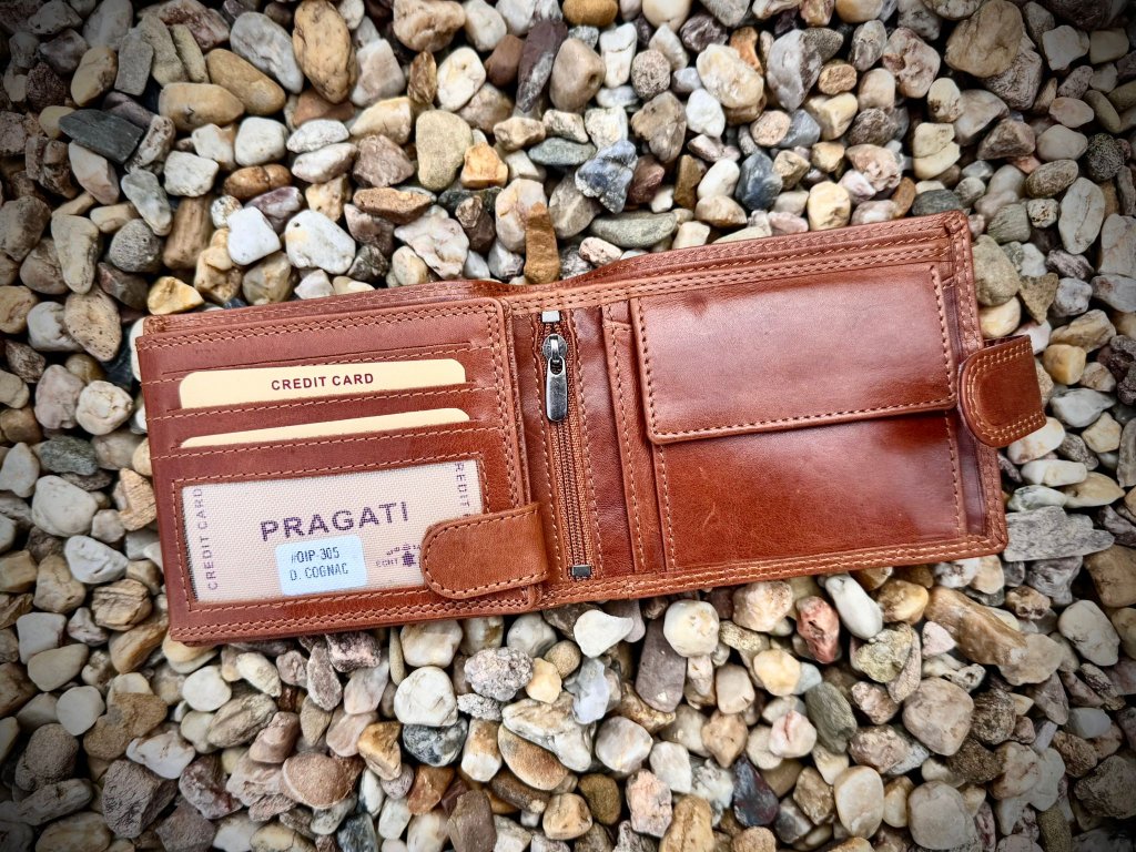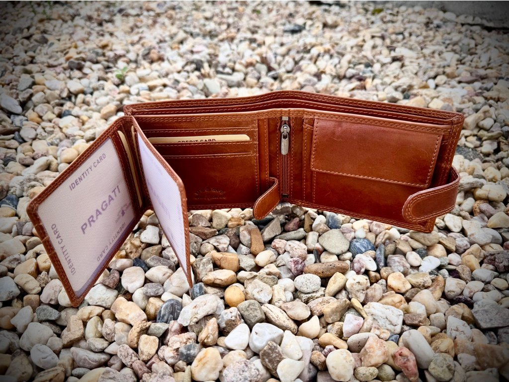 Kožená peněženka z telecí kůže, obsahuje přihrádky na bankovky a platební karty i kapsičku na mince.
